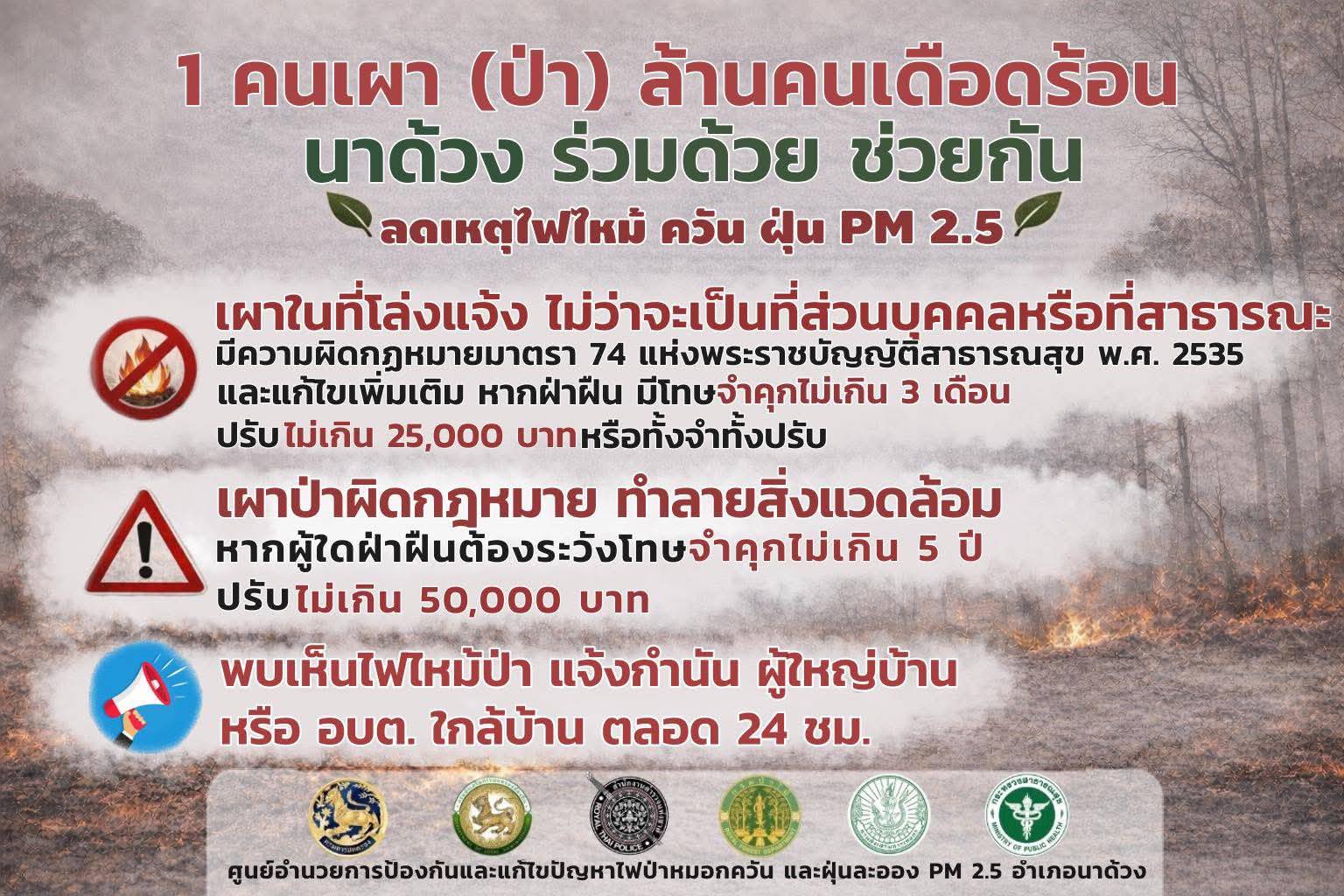 ❌❌ งดการเผาในที่โล่ง ไม่ว่าจะเป็นพื้นที่ส่วนบุคคลหรือที่สาธารณะ ถ้าฝ่าฝืนมีความผิดตามกฎหมาย