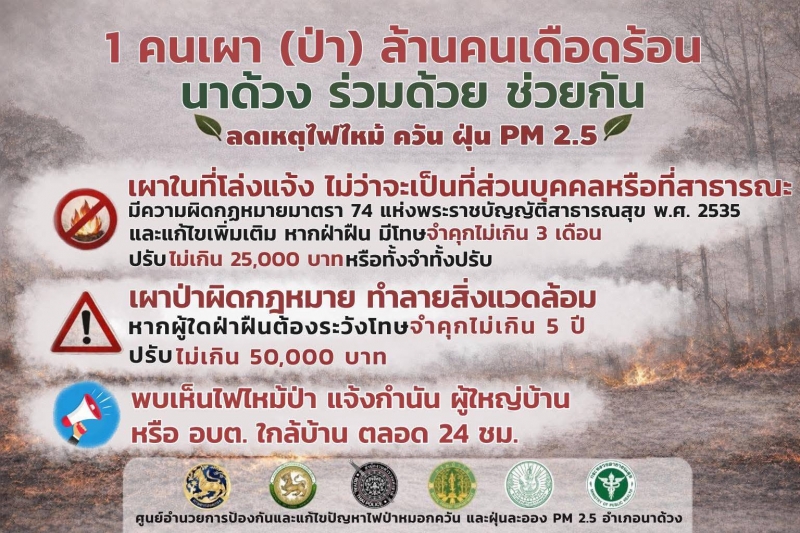 งดการเผาในที่โล่งทุกกรณี เพื่อเป็นการช่วยลดปัญหาไฟใหม้ป่าและหมอกควัน ลดฝุ่นละออง PM 2.5 ที่จะส่งผลกระทบต่อสุขภาพและสิ่งแวดล้อม